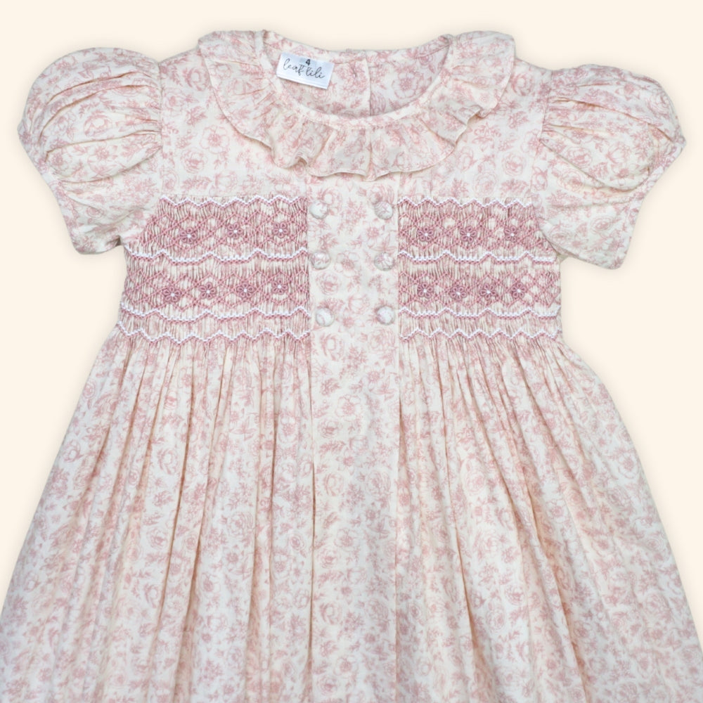 Delicate embroidery enhances the smocked panel, with the small decorative buttons down the center adding a timeless, heirloom touch.