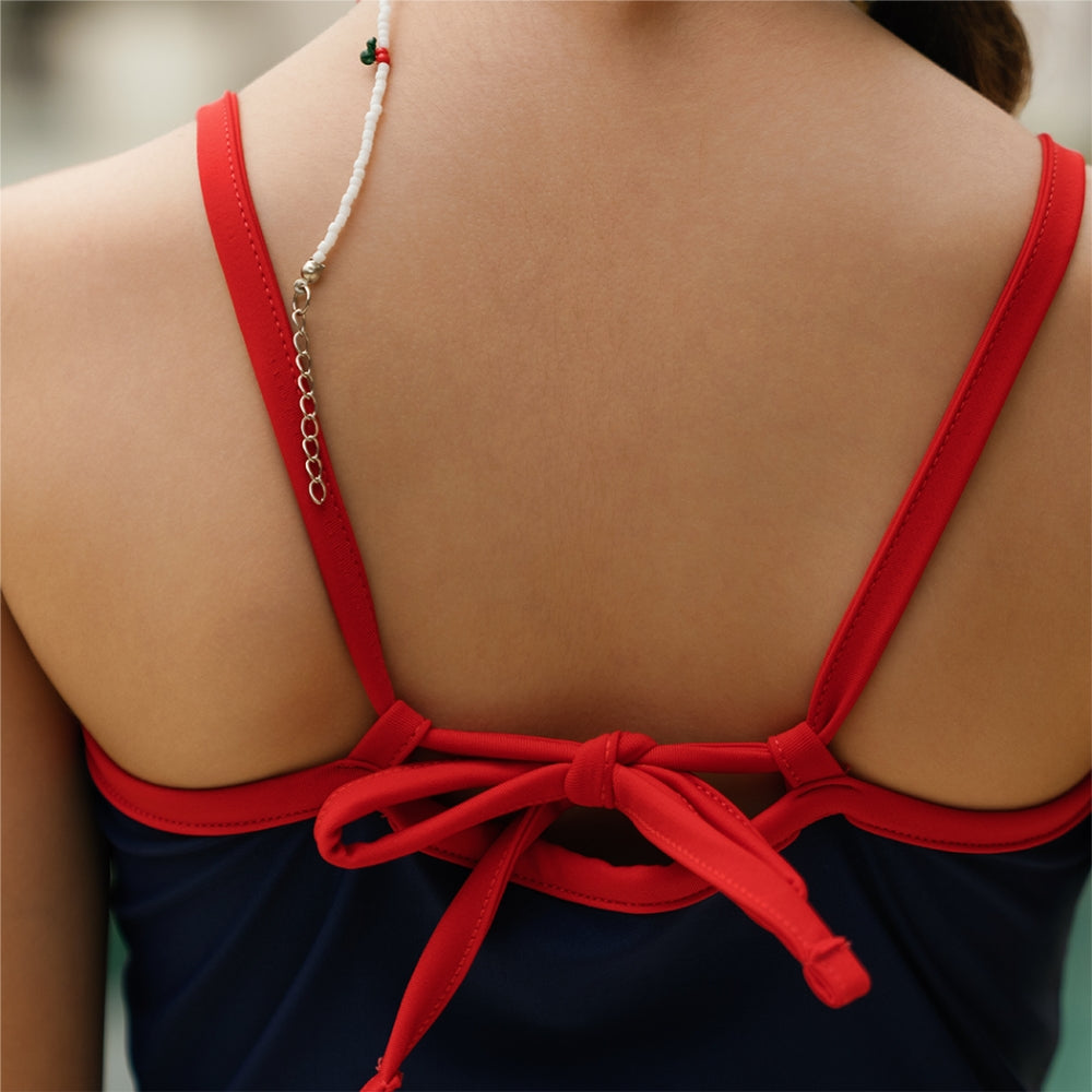 A simple chic leotard is a classic swim piece designed for comfort, flexibility, and easy movement in the water. Made from soft 4-way stretch fabric, it allows kids to swim, splash, and play freely. Finished with a tie-back ribbon design for an adjustable fit and a delicate embroidered cherry detail for a playful touch.