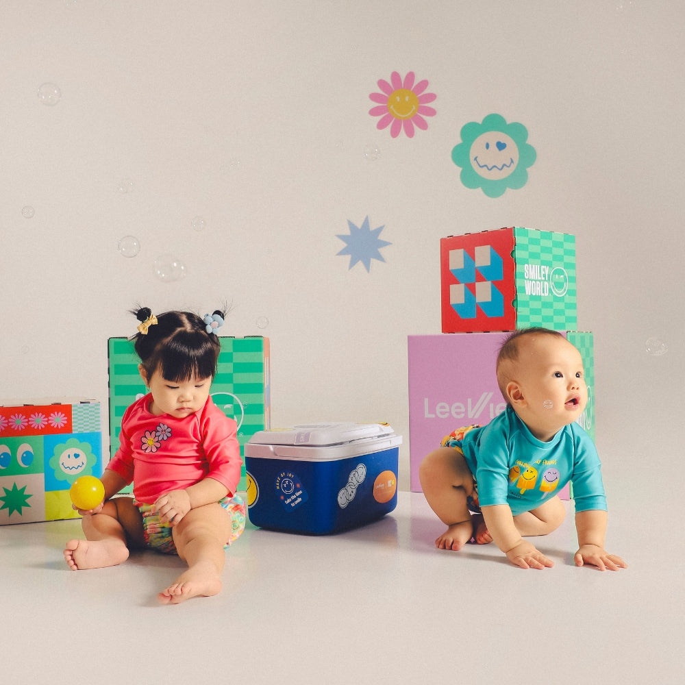 Available in two looks: a pink flower motif or a teal ice-cream print. Pairs with Smiles & Tides Swim Diapers for a coordinated set.