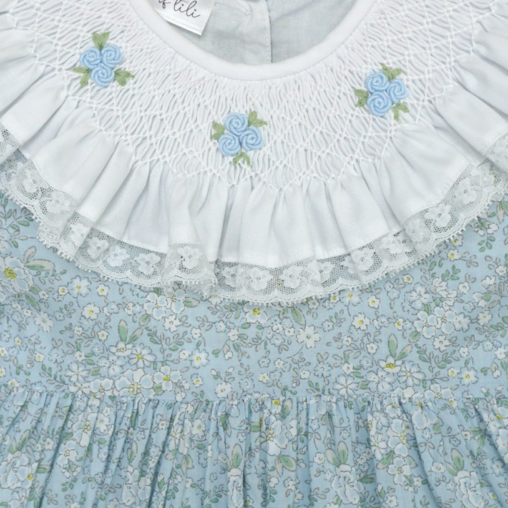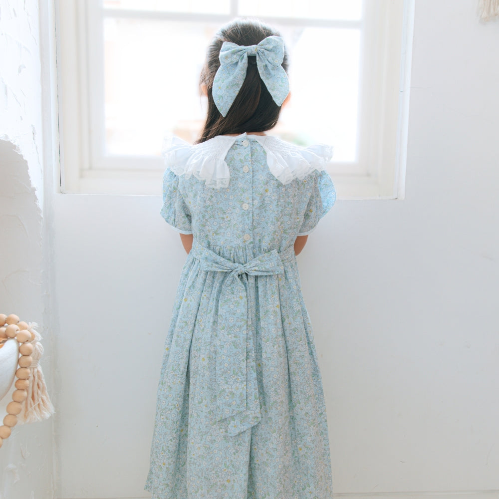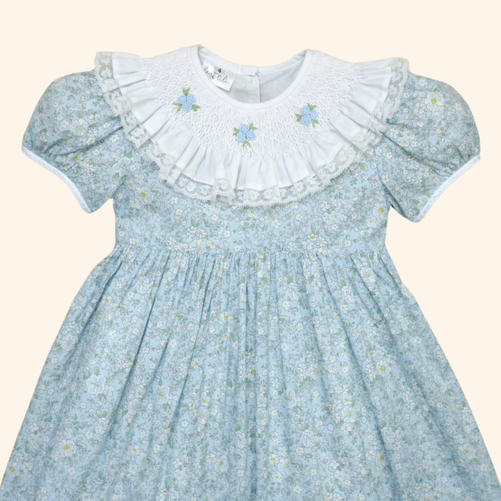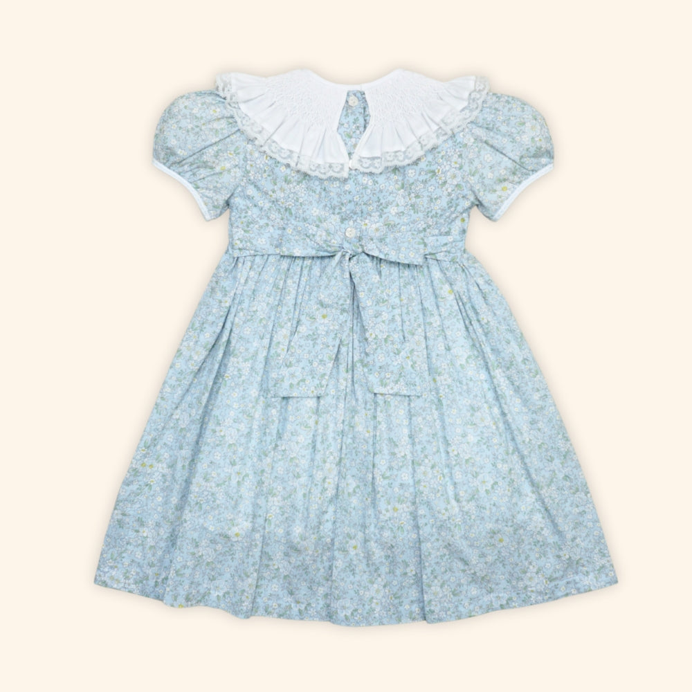 The highlight is its beautifully hand-smocked collar, accented with dainty floral embroidery that adds a refined, artisanal touch, together with a softly flowing silhouette and short sleeves, the Hannah Dress offers both comfort and classic charm in one sweet design.