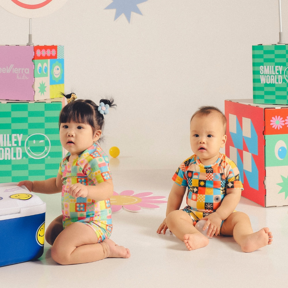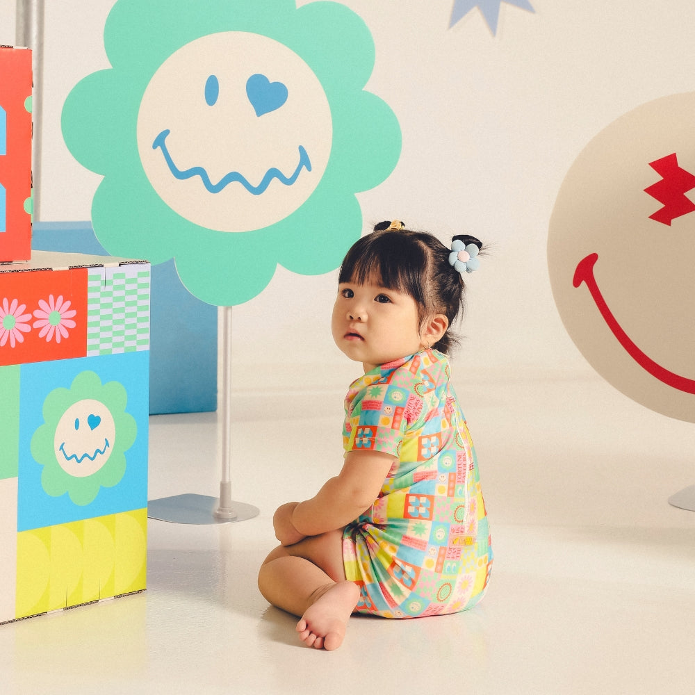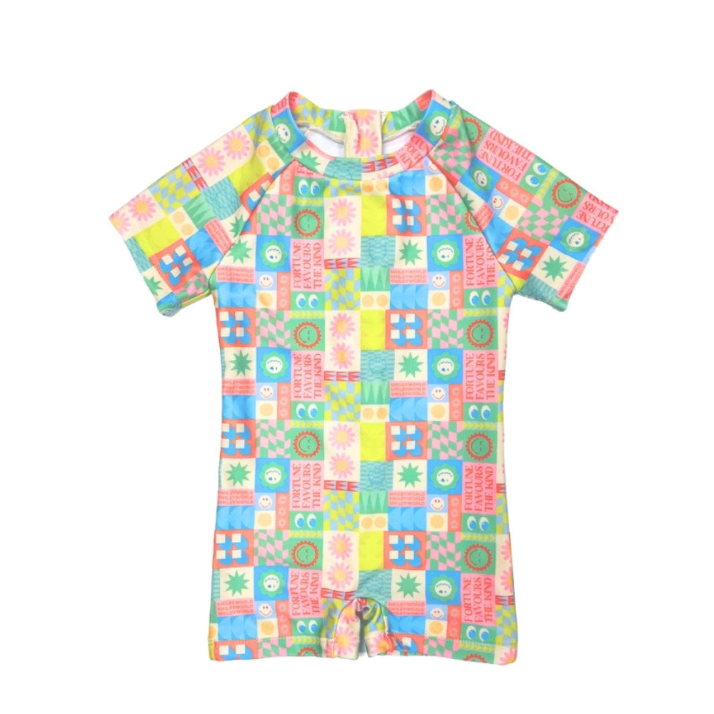 A short-sleeve one-piece with colorful prints and UPF 50+ protection.
