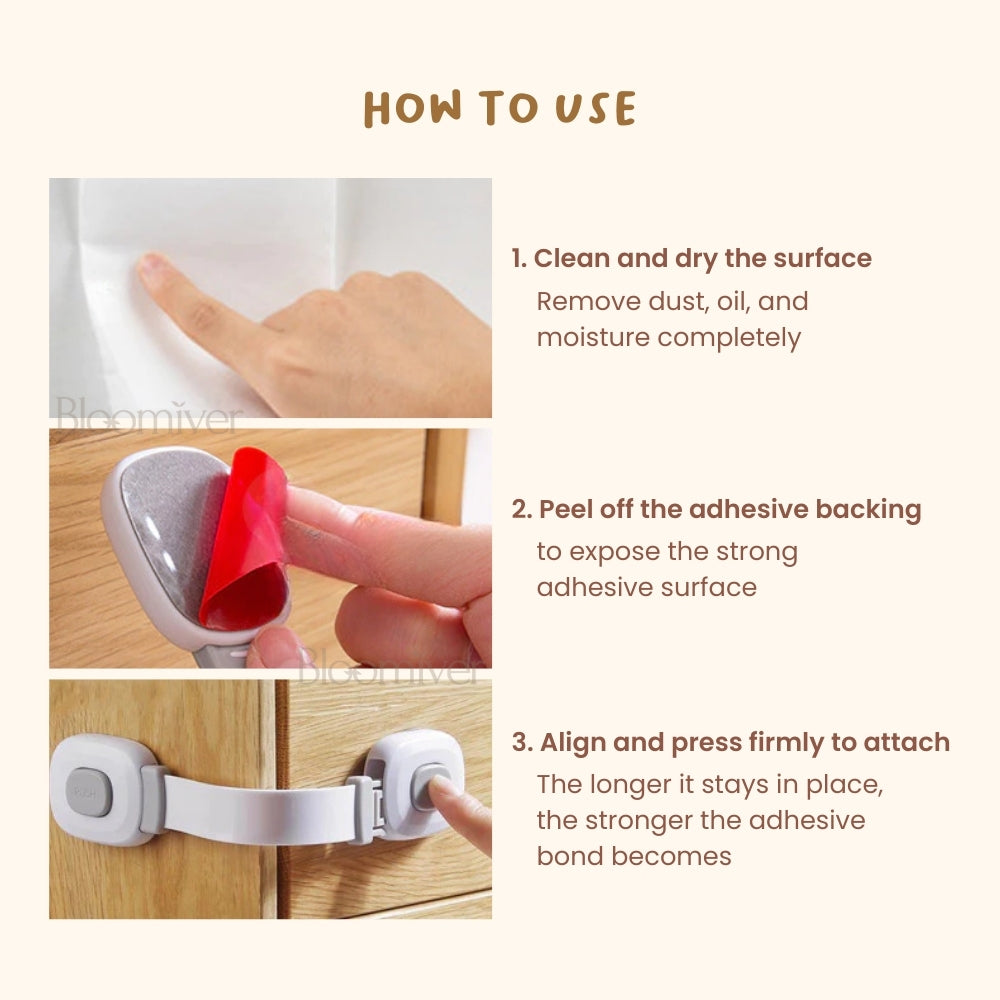 Ideal for securing cabinet doors, drawers, refrigerators, and other household appliances, to helps prevent accidental access during baby’s exploration.