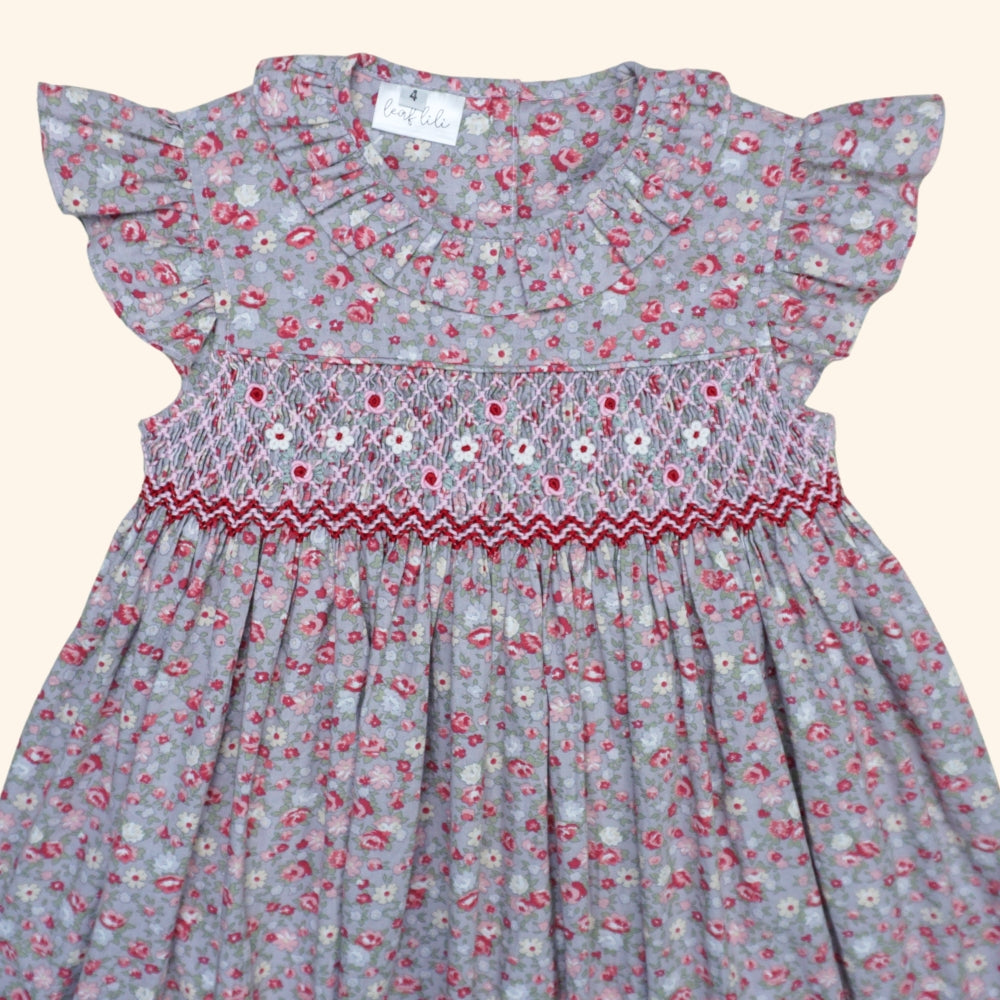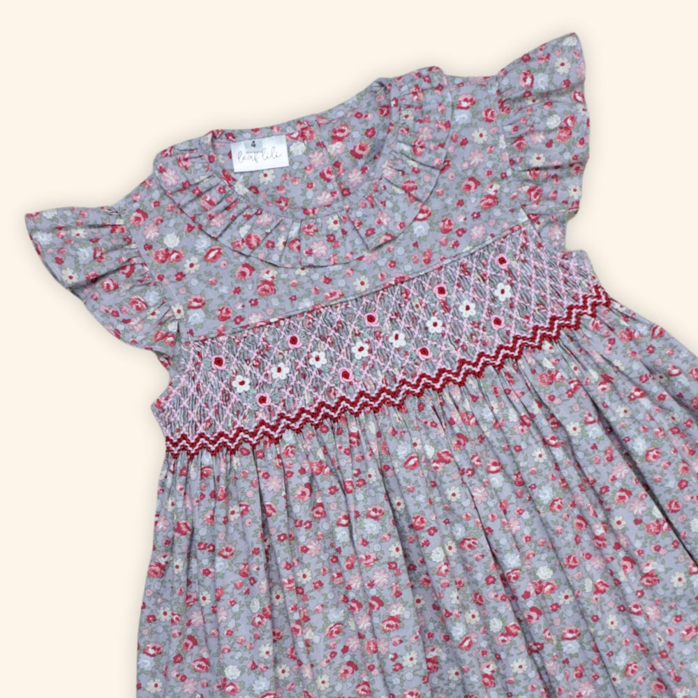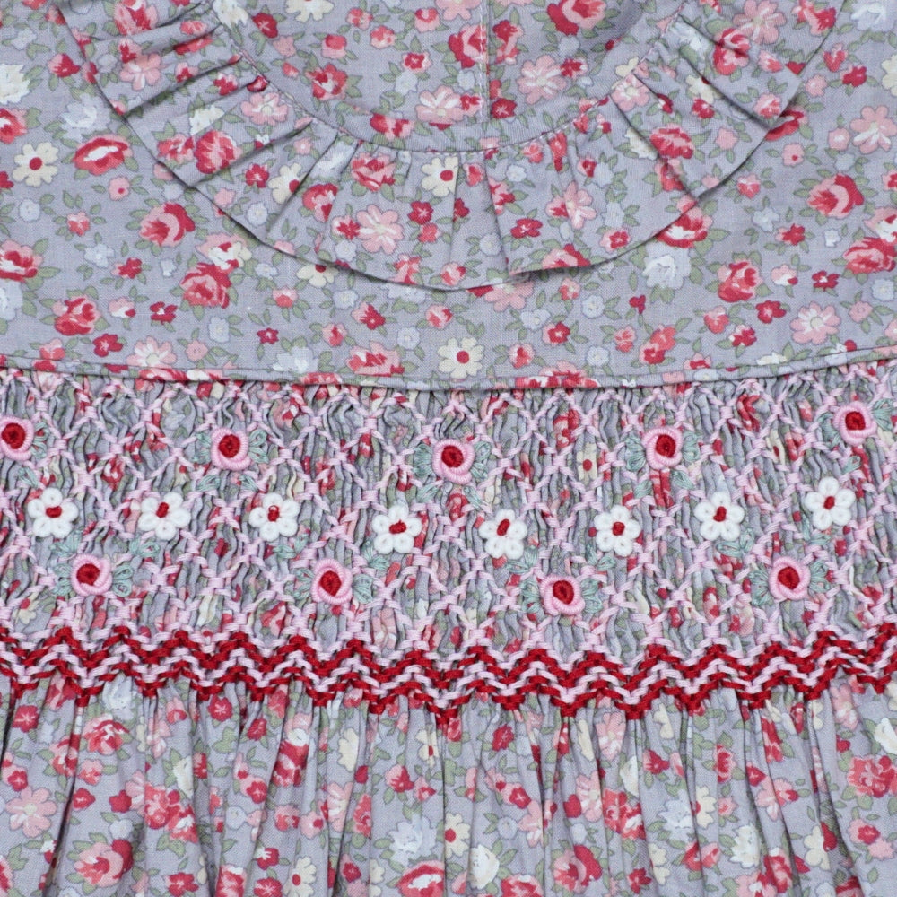 Features a beautifully hand-smocked bodice adorned with delicate stitching that adds both texture and elegance.