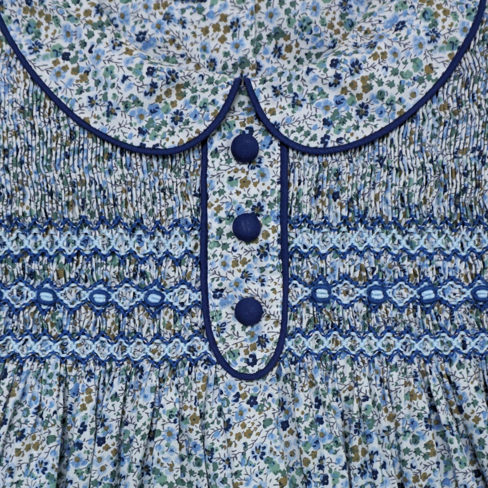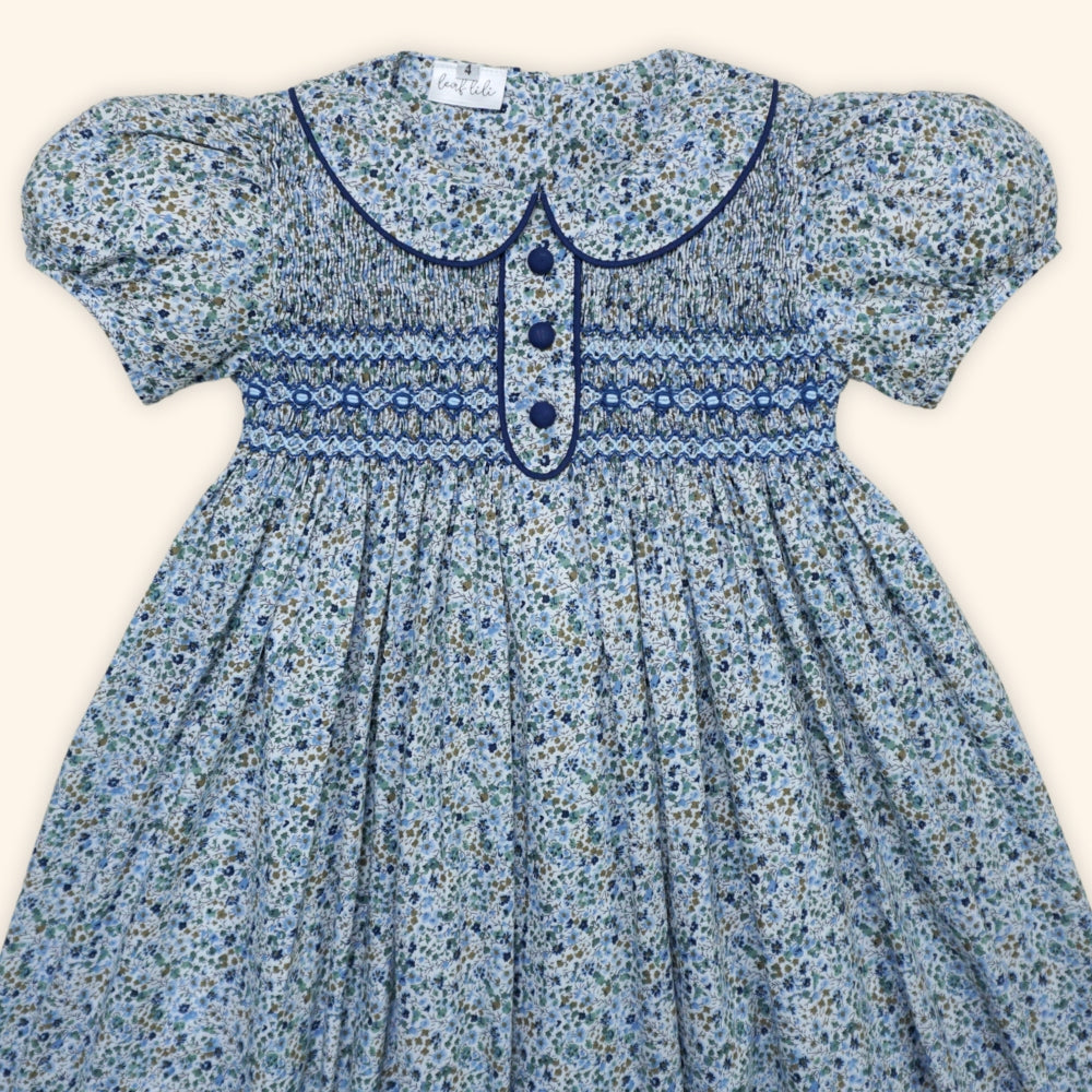 The Kristelle Dress showcases a lovely blue–navy colour palette, sprinkled with tiny blossoms in soft complementary tones.
